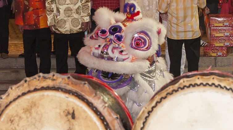 One of the most amazing acts is chingay, aย show of skill and precision. Men with their heads wrapped in cloth take turns balancing a 15 metre-long flagpole on their foreheads, pass it to one another, throw it into the air and back.